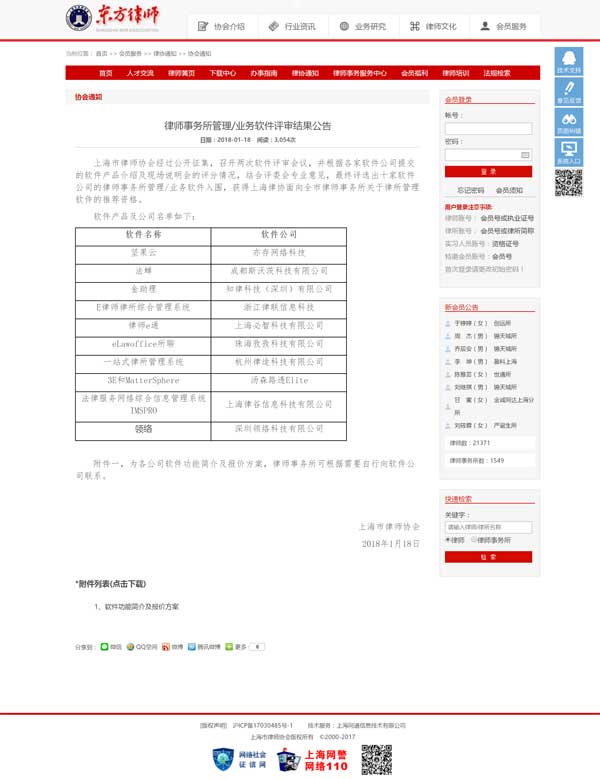 上海市律師協會經過公開征集,召開兩次軟件評審會議,并根據各家軟件公司提交的軟件產品介紹及現場說明會的評分情況,結合評委會專業意見,最終評選出十家軟件公司的律師事務所管理/業務軟件入圍,獲得上海律協面向全市律師事務所關于律所管理軟件的推薦資格。
