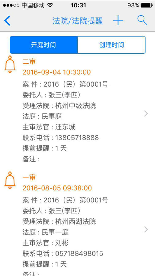 開庭提醒:可以自設(shè)置提前幾天提醒,開庭2小時前,系統(tǒng)默認再次提醒
