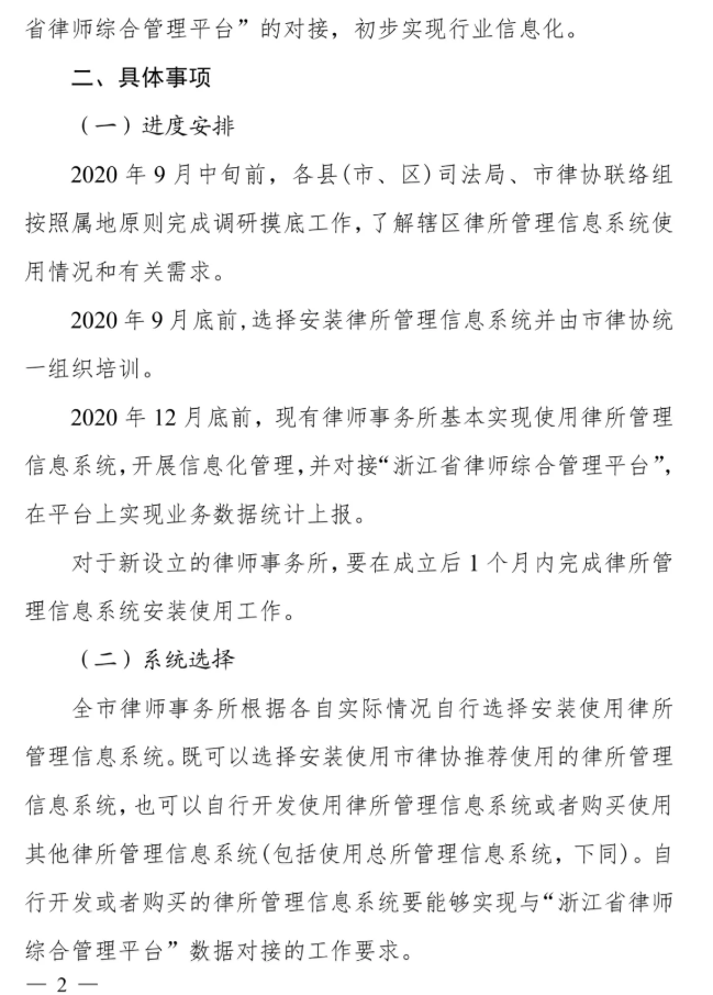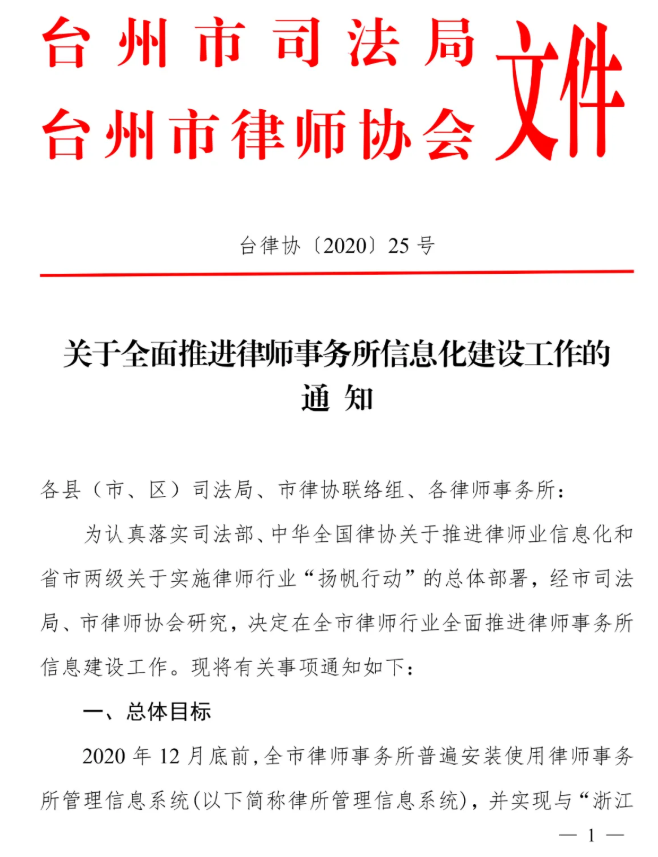 繼杭州、寧波市司法局之后,臺(tái)州市司法局、臺(tái)州市律協(xié)發(fā)布的臺(tái)律協(xié)(2020)05號(hào)文件:《關(guān)于全面推進(jìn)律師事務(wù)所信息化建設(shè)工作的通知》,預(yù)計(jì)目標(biāo)將于2020年12月底前,推進(jìn)臺(tái)州全市律師事務(wù)所信息化建設(shè)工作,并實(shí)現(xiàn)與浙江省律師綜合管理平臺(tái)完成對(duì)接,初步實(shí)現(xiàn)律師行業(yè)信息化。