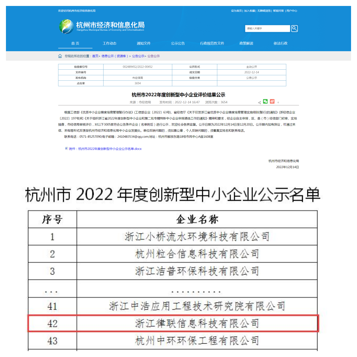 浙江省杭州市經濟和信息化局公示“2022年創新型中小企業”名單,律聯科技公司被認定為2022年度創新型中小企業,是對公司在科技創新能力、核心自主知識產權、科技成果轉化能力、企業自主成長能力等方面的充分肯定。